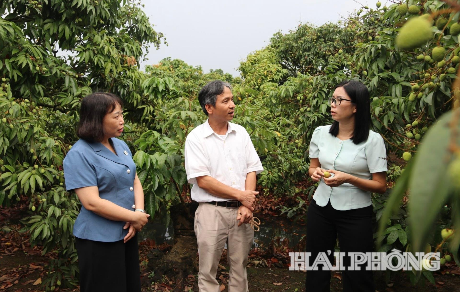 Bà Nguyễn Thị Thu Hương - Phó Cục trưởng Cục Trồng trọt và Bảo vệ thực vật (bên phải ảnh) và bà Lương Thị Kiểm - Phó Giám đốc Sở Nông nghiệp và Môi trường Hải Phòng kiểm tra thực tế tình hình sản xuất tại vườn vải phục vụ xuất khẩu ở xã Thanh Hà.